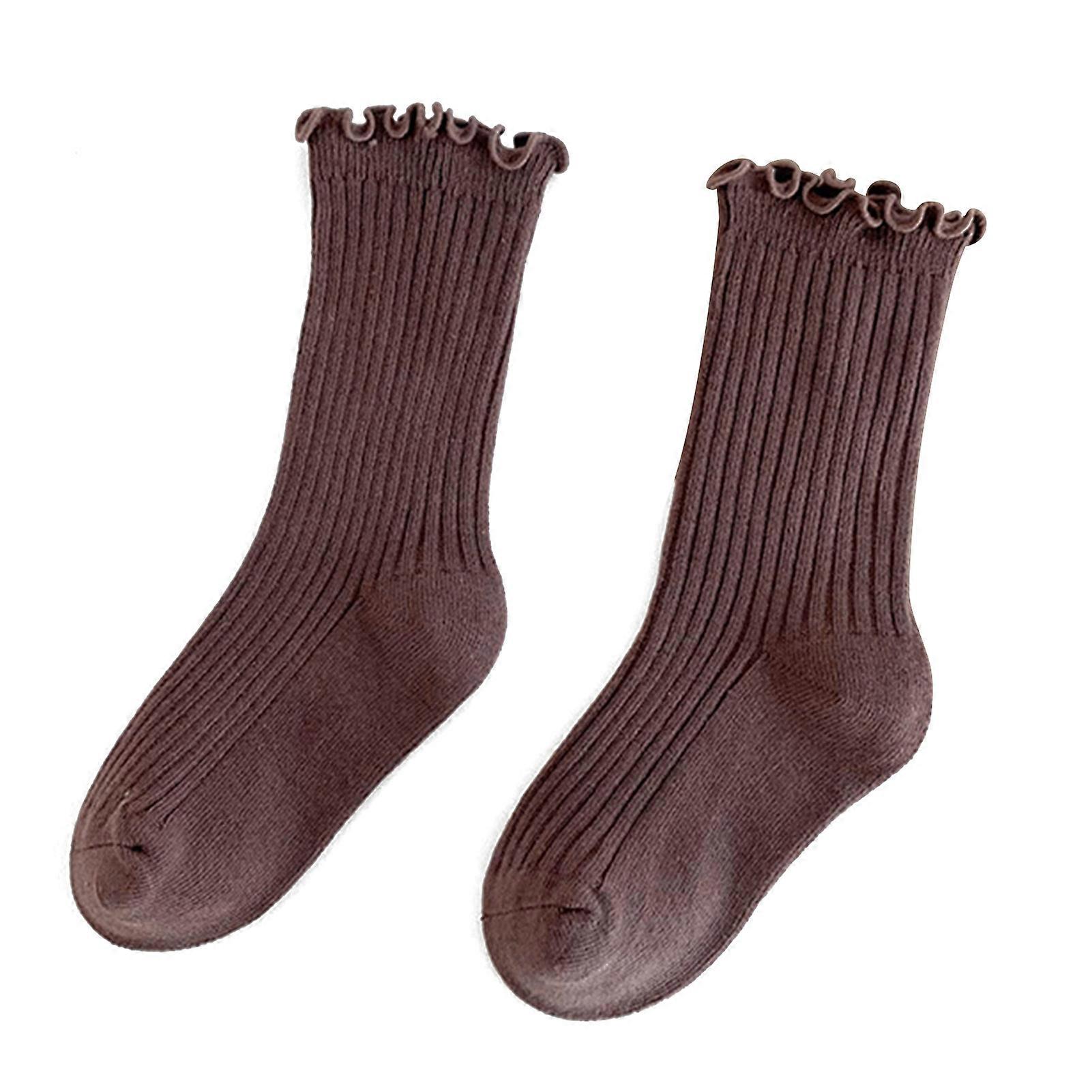 Kids Crew Socks Ruffle Ripple Edges Combed Cotton Mid Calf Knitted Kids High Ankle Socks for Spring Autumn Brown