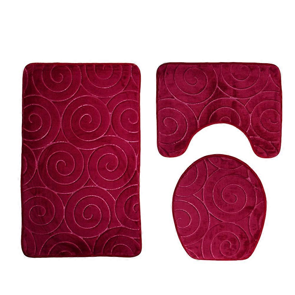 Three Pieces Bathroom Mat Set Flannel Embossed Circle Nonslip Bath Bathtub U-shape Rug Carpet Toilet Seat Lid Cover (Red)