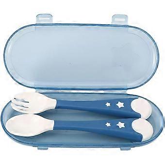 2 pcs baby cutlery spoon and fork, portable infant feeding training fork spoon non-slip baby cutlery set with travel case for weaning (blue)