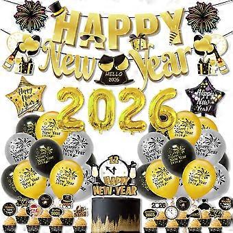 Product Name: New Year Themed Party Balloon SetBalloon Material: 12-inch 2.8g latex balloons.Paper Material: 300g white cardboard.Packaging: OPP bags.Aluminum foil balloons: Numbers 16 inches, five-pointed stars 18 inches.Pin Flags (91g): 18*20cm, 12 cards, 5 meters of ribbon.Cake Stickers (20g): Large card: 15*15cm, Small card: 5*5cm.New Year Photo Props: Our set includes a variety of fun photo props, allowing you to easily capture memorable moments with family and friends as you bid farewell to the old year. Easy assembly means more time to enjoy the festive atmosphere and less time to prepare decorations.Happy New Year Party Supplies: Make 2026 a year to remember! This classic themed decoration is perfect for New Year's Eve parties, New Year's Eve parties, and themed parties, creating a cheerful atmosphere and welcoming the new year. Versatile: This decoration is not only perfect for New Year's Eve parties, but it's also incredibly versatile. Use it for birthdays, anniversaries, or any other special event throughout the year, ensuring it continues to add festive cheer to your party.Package Contents: 1 Set of Golden Fireworks: Aluminum Film (16-inch 2026 + 2 Five-Star) + Pull Flag + 18 Balloons (6 black, 6 gold, 6 silver) + 16 Inserts + 2 Black Ribbons.Note: 1. Due to different monitors and lighting effects, actual colors may vary slightly from the image.2. Due to manual measurement, please allow 1-3 cm deviation.