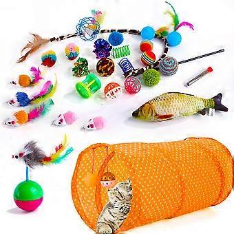 28Pcs/Set Cat Toys Set with Orange Tunnel Interactive Cat Toy Feather Fish Mouse Crinkle Balls