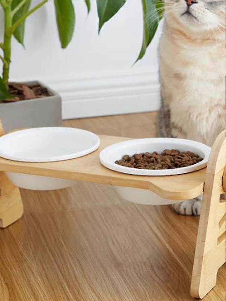 Ceramic Double Bowl with Adjustable Height and Bamboo Rack for Pets, Protects Cervical Spine and Prevents Spills