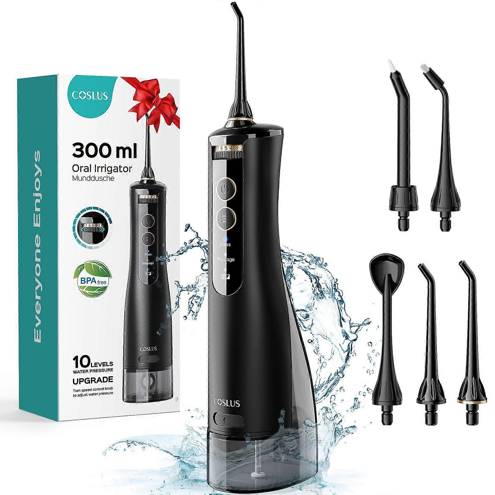 Description This portable electric oral irrigator is not only functional but also stylish. The sleek design adds a touch of elegance to your bathroom counter. Its compact size and cordless feature make it a travel-friendly oral irrigator, ensuring you can maintain your oral cleaning routine even when you're. Features -Brand: COSLUS -Input: 5V 2A Max -Voltage: 3.7V -Power: 5W -Battery capacity:1400mAh -Noise:<72db -Waterproof rating:IPX7 -Water pressure range:30-150PSI -Storage temperature:0-40 -Color:Black -Material:ABS, silicone -Size:23.80X8.50X6.00cm/9.35X3.34X2.36in -Classic appearance: With its sleek and modern aesthetic, this oral irrigator not only functions well but also enhances the look of your bathroom -Convenient adjustment: The handheld oral irrigator with speed control knob allows you to easily adjust the water pressure, ensuring a practical comfortable cleaning routine -Effective cleaning: Designed to provide strong water jets, this rechargeable flosser effectively eliminates plaque and debris, promoting excellent oral conditions -Comfortable to use: The ergonomically designed body makes sure a secure and comfortable hold, making it easy to use during your oral care routine -Easy operation: Featuring user-friendly buttons, this oral irrigator allows for easy and convenient setting adjustments, making your oral care straightforward -Rechargeable battery: Equipped with a rechargeable battery, this portable flosser provides the convenience of cordless operation, eliminating replacing batteries -Water tank: The water reservoir offers ample capacity for extended use, minimizing the need for refilling water consistently, suitable for daily use -Cordless feature: This cordless oral irrigator offers the flexibility to use it anywhere in your home without being limited by power cords -Safe to use: Constructed with multiple safety features, this oral irrigator is safe to use in wet environments, such as the bathroom, including during showers -Lightweight and compact: Its compact and lightweight size makes this portable oral irrigator easy to handle and ideal for travel, providing you with great convenience and versatility Package list: 1 x COSLUS Oral Irrigator 1 x box 1 x charging cable 5 x nozzles 1 x white box 1 x manual 1 x warranty card