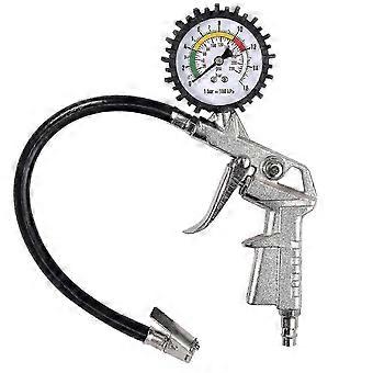 Product Information Made of high quality aluminum alloy, one-piece forged shape, non-slip handle (metal screws inside), brass air liner and gaskets. This guarantees the strength and durability of the product.Product advantages Classic pressure gauge display, purely mechanical, easily readable value. A special rubber coating protects the pressure gauge from light impacts, with quick connectors complying with EU standards, suitable for most air compressors on the market.Multifunction use Air inflators Tires have a total of 3 functions. It can not only measure tire pressure, but also inflate the air for the tire or let the air out of the tire.Easy to use Simply connect the lock connector to the valve and use the lever to pump or depressurize your tires. Suitable for small and medium-sized commercial vehicles, motorcycles, cars and bicycles.Product information:Handle with control lever and release button (for easy one-handed operation).A calibrated pressure gauge that accurately measures tire pressure.The value is 0 to 16 bar. Accurate readings and intuitive measurements.No battery adjustment, no sudden power failure.Material: aluminum alloy.Color: black, silver.Quantity: 1 piece Note: Due to the light and screen setting difference, the item's color may be slightly different from the pictures. Please allow slight dimension difference due to different manual measurement. Sold by-Dadangjia