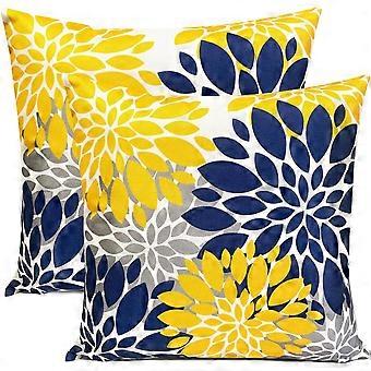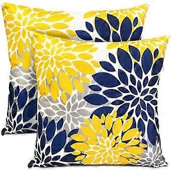 Set of 2 Decorative Throw Pillow Covers, 18x18", Blue & Yellow Linen Floral Farmhouse Style – Compatible with 18x18" Inserts